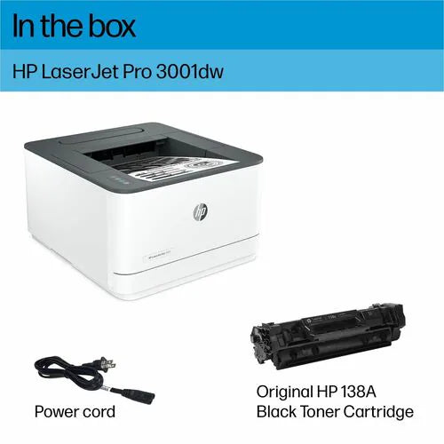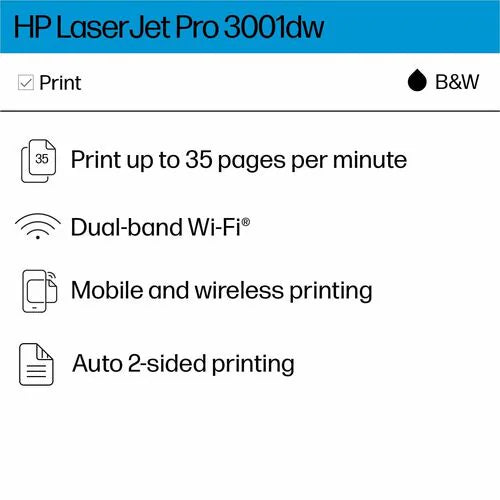 HP LaserJet Pro 3000 3001dw Desktop Wireless Laser Printer - Monochrome - 35 ppm Mono - 1200 x 1200 dpi Print - Automatic Duplex Print - 250 Sheets Input - Ethernet - Wireless LAN - HP Smart App, Apple AirPrint, Mopria, Wi-Fi